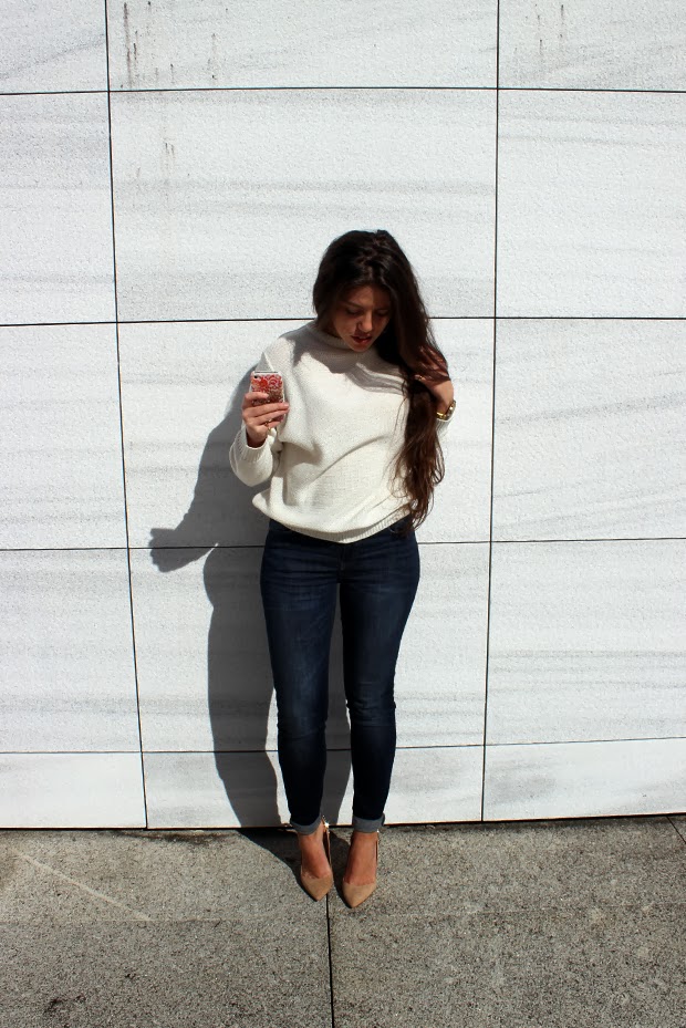 Taking advantage of a day without rain to take these pictures, and here a more fresh and light outfit to escape to the black routine (which I a-d-o-r-e). Well, I don't know about you, but sometimes I start my outfits by the accessories. Mostly the protagonists are the shoes, but at this time inspiration came from the phone case. It's full of colors I like and in leopard print. Combining with it a golden rings and the watch from always. In fund the basics, new jeans from sales, a white knitwear and a nude stilettos (and I was missing to wear these shoes). Hope you enjoy it! As for the phone cover, you can find this and many others on the brand's site here, peek it!!