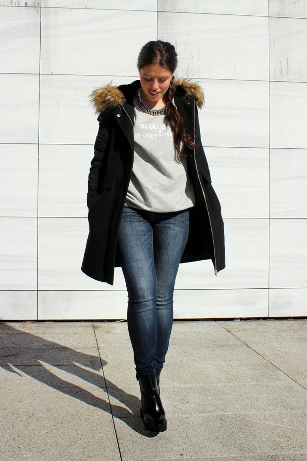 Do you remember I've spoken here that the sales season were excellent to invest in basic pieces? Well, little by little I have done that and more and more I realize that I need fewer pieces like this. In addition to the white shirt I've showed you last New in! post I also found this black coat. I have to say I bought it for necessity and even at the beginning I haven't thought big joke to the model (I had another one in mind, which had completely disappointed me when I tried it). But all that changed when I start using this coat. Besides being super comfortable and warm has the advantage that I don't look like a potatoes sack when I tightening the lock up top (all we've already feel it right?!). Well, the truth is that the days have been cold and rainy and I haven't dropped my new coat. Just like the gray sweater. You know I love sweaters and t-shirts with messages, furthermore this is gray, the 3rd in the drawer, but as the black boots and shoes, white shirts and jeans, grey sweaters are never is too much!